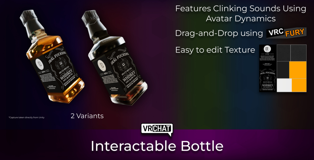 Clink with your fellow partygoers with this specially equipped virtual bottle! Enjoy two versions, optimized and normal, both powered by VRCFury.